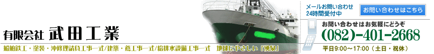 武田工業では、船舶・造船・沖修理の緊急対応をお請けしております。緊急対応が必要な方は下記の携帯電話へ直接ご連絡ください。瀬戸内海全域および九州北部地域(福岡・佐賀・長崎・大分)まで、即現場へ駆けつけます。