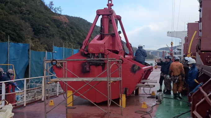 グラブバケット ピン調整・バケット爪肉盛り溶接 (岸壁工事)